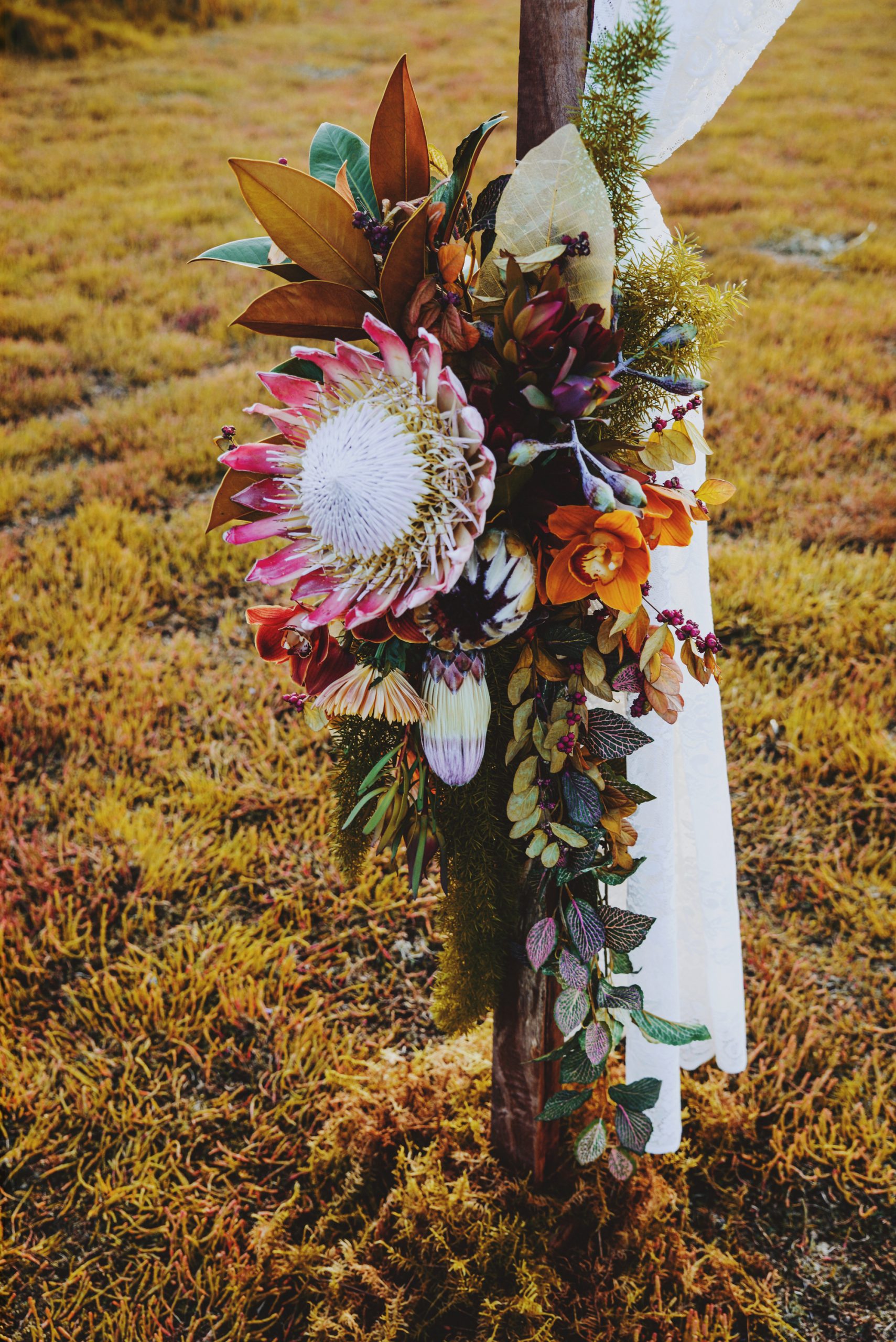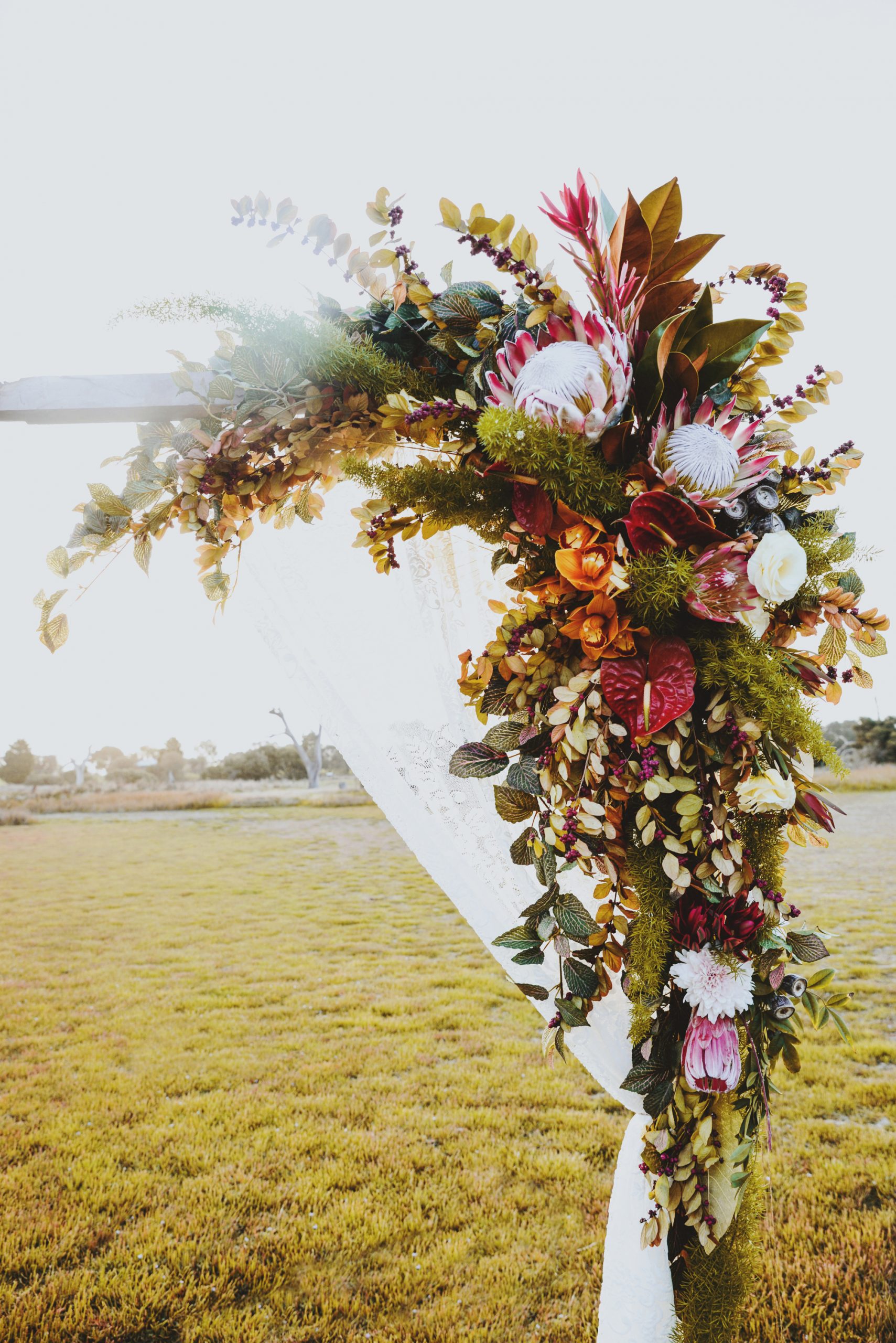 Set amongst the beautiful Minya Winery in Victoria, 15 minutes from Torquay, this creative team from Victoria put together a stunning wooden arbour adorned with gorgeous, floral arrangements made up of eye-catching banksia, orchids and anthuriums in rustic shades of red, burnt orange, forest green and apricot.