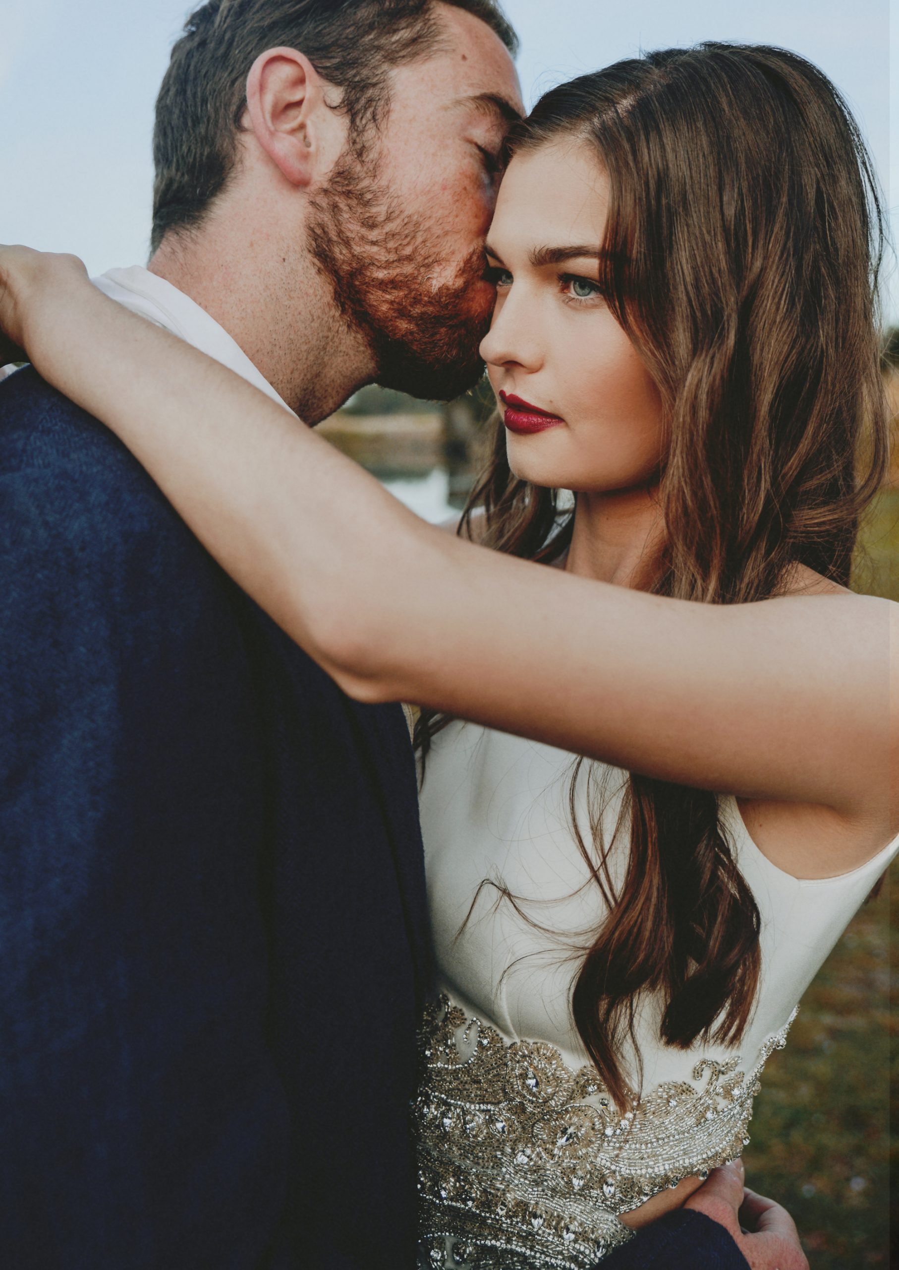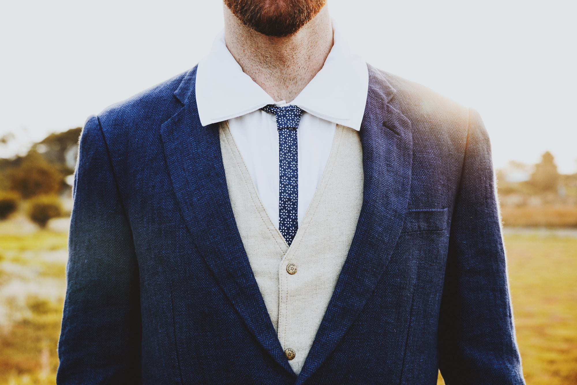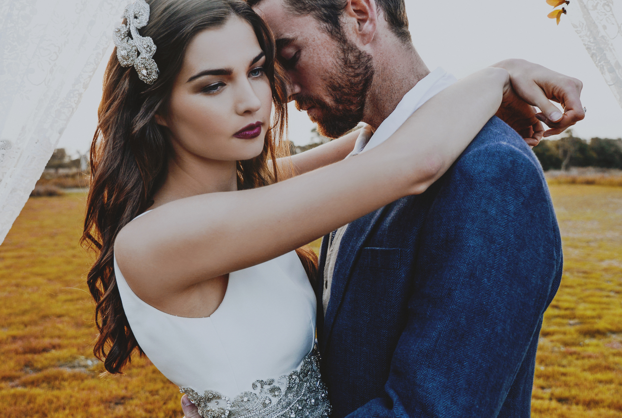 Beneath it stood one very handsome groom, dressed in navy linen and a patterned skinny tie by Roger David – a suitable alternative to their last inspiration shoot. By his side was an equally attractive bride, well dressed in a stunning gown by Kara Jade Designs and jewellery by  Meadowlark. It was her beautiful blooms however, that had us at hello.