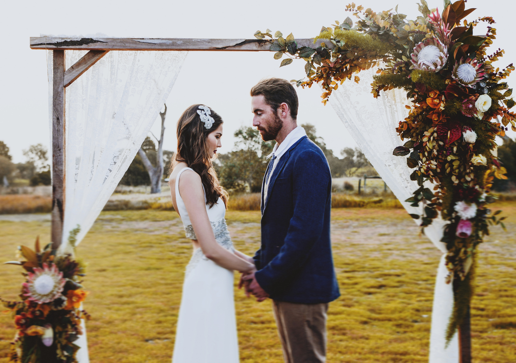 Shining the spotlight on native floral arrangements, Bridget from Blooms by Bridget and stylist Peppa & Peach again joined forces with Enchanted Wedding Photography and makeup artist Alana Waldron to create these beautiful, inspiring images you see before you.