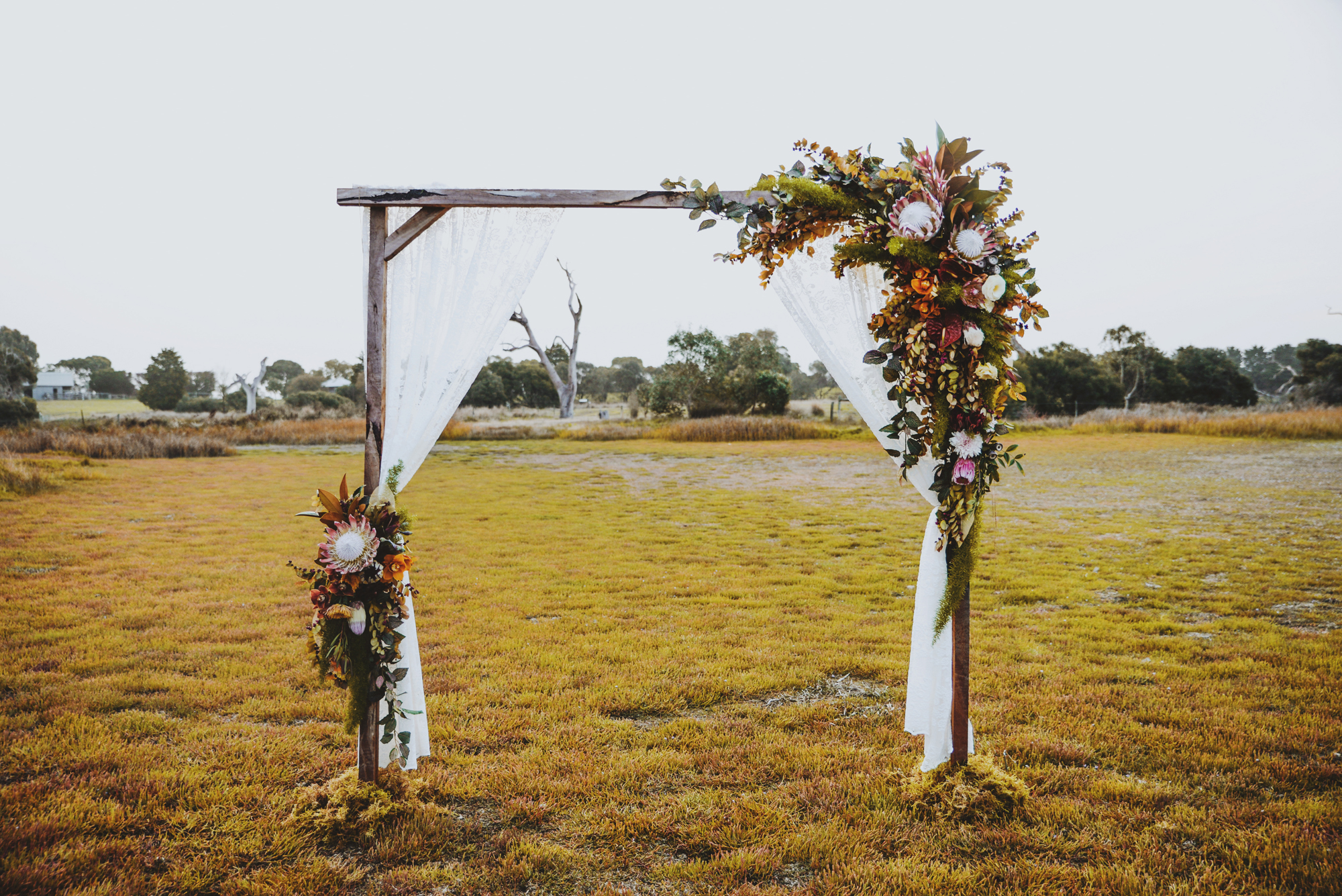 Set amongst the beautiful Minya Winery in Victoria, 15 minutes from Torquay, this creative team from Victoria put together a stunning wooden arbour adorned with gorgeous, floral arrangements made up of eye-catching banksia, orchids and anthuriums in rustic shades of red, burnt orange, forest green and apricot.
